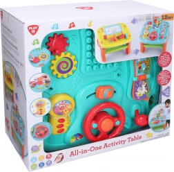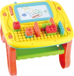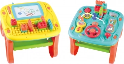 Dvostranska aktivna mizica 37 cm združuje zabavo in učenje v enem. Zgornja stran z volanom, prestavno ročico in ropotuljicami razvija fino motoriko in čutno zaznavanje, medtem ko spodnja stran z magnetno risalno tablo in podlogo za kocke spodbuja ustvarjalnost in domišljijo.