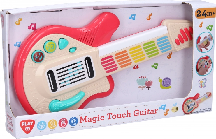 Odkrijte prve glasbene korake z dotikalno električno kitaro PLAYGO. Zahvaljujoč dotikalnim senzorjem na vratu in ohišju instrument reagira na nežen dotik in predvaja posamezne tone. Svetlobni učinki dopolnjujejo doživetje, medtem ko pregledni gumbi omogočajo spreminjanje melodij, popačenja in glasnosti.