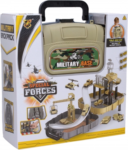 Pustolovski set za male ljubitelje vojske: vojaška postaja z progo, dvigalom, žerjavom, heliportom in 2 avtomobilčkoma v priročnem nahrbtniku z naramnicami. Idealno za doma in na poti, z slikovnim priročnikom za enostavno sestavljanje.