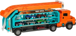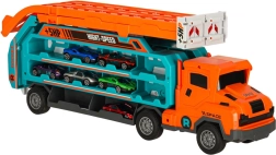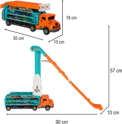 Multifunkcijski tovornjak na prvi pogled služi kot praktičen nosilec – sprejme do 6 malih avtomobilčkov in omogoča njihov enostaven prevoz. V nekaj trenutkih pa se spremeni v impresiven dirkalni set z dvema vzporednima stezama za dinamične dvoboje in fair play zabavo med sorojenci.