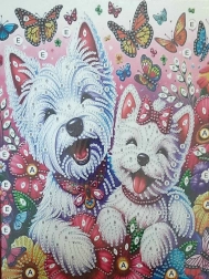Ta komplet za diamantno slikanje je idealen za začetnike in napredne. Predtiskano platno z motivom »Veseli kužki« in s trdnim okvirjem drži obliko, kamenčki čudovito odbijajo svetlobo, končna slika pa bo razveselila vas in vaše bližnje. Dovolj je, da sledite legendi in lepite kamenček za kamenčkom – je preprosto, pomirjujoče in zabavno.
