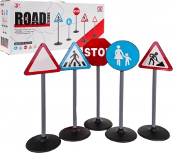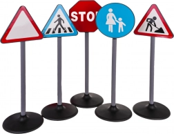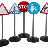 Ta set prometnih znakov vsebuje pet različnih znakov: stop, prehod za pešce, opozorilni trikotnik, dela na cesti in pločnik. Izdelani so iz kakovostne plastike in realistično oblikovani s poudarkom na detajlih. So dimenzijsko prilagojeni otrokovi višini, kar jih naredi idealno izobraževalno igračo za najmlajše.