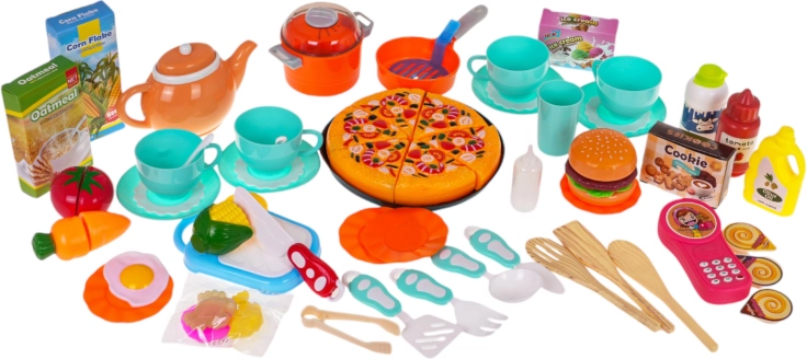 Ne manjka plošča z ventilatorjem in učinki, telefon z zvoki (zvonjenje, živali, pesmica) ter številne poličke za shranjevanje živil in pripomočkov. Set je bogato opremljen – od loncev, ponv, pripomočkov in posode do pice, zelenjave na ježka in drugih živil. Za dodatno zabavo poskrbi tlačni lonec na baterije, ki ustvarja mehurčke in zvoke kuhanja; tri živila (riba, rak/krab, kos mesa) v njem spremenijo barvo.