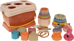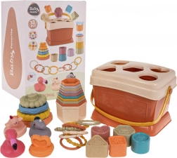 Otroški komplet z oblikami in sortirnikom je odličen izobraževalni komplet za otroke od 6 mesecev naprej. Razvija otroško domišljijo ter jih uči prepoznavati barve in oblike. Vsak element tega kompleta je zasnovan tako, da z živahnimi barvami in zanimivimi oblikami pritegne pozornost otrok in jih spodbuja k igri.
