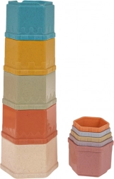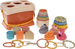 Komplet vsebuje oblike, primerne za gradnjo in razvrščanje, kar pomaga razvijati fino motoriko. Otroci lahko poskusijo zlagati stolpič ali ustvarjati različne konstrukcije. Vse dele je po igri mogoče enostavno pospraviti v praktično škatlo, kar otroke uči ohranjati red.