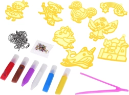Ta zabaven komplet za izdelavo obeskov razvija ustvarjalnost, fino motoriko in občutek za detajle. Šablone z reliefom olajšajo nanos barve brez prelivanja, bleščeči kamenčki pa otrokom omogočijo, da zlahka dokončajo izviren videz vsakega kosa. Končane obeske lahko preprosto obesite na priložene kovinske verižice.