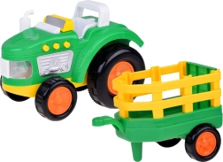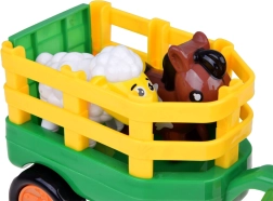 Rumeno‑zelena prikolica se odpira za enostavno nalaganje in razkladanje. Otroci lahko prevažajo konja in ovčko ter ustvarjajo svoje kmečke zgodbe.