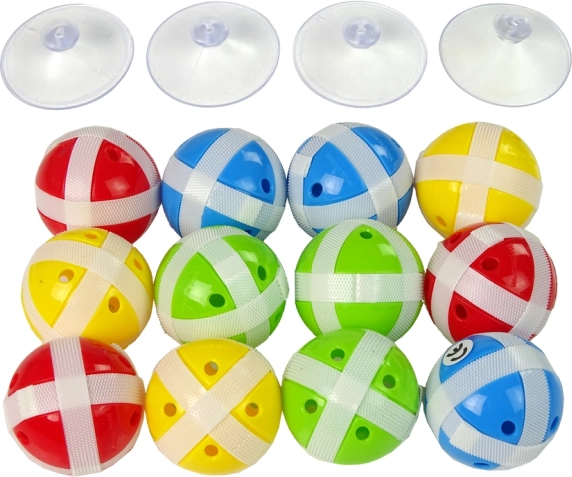 12 lahkih žogic v 4 barvah se zanesljivo pritrdi na tarčo in so nežne do pohištva ter otroških rok.