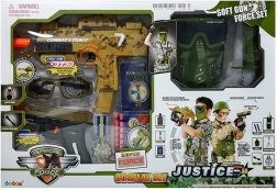 Komplet je idealen za igro v dvoje: en mali vojak lahko obleče čelado, telovnik in zaščitna očala, drugi masko in gumijasti nož. Za interaktivno zabavo poskrbijo funkcionalna svetilka, radijska postaja, daljnogled, kompas in strelski tarč za trening natančnosti. Varni materiali in izraziti barvni elementi naredijo komplet odlično darilo za otroke od 3 let.