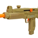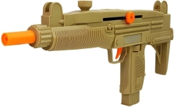 Glavna pištola, napajana z 3× AG13 (v kompletu), ob pritisku na sprožilec oddaja zvoke streljanja in svetlobne učinke – varna zabava brez izstrelkov.