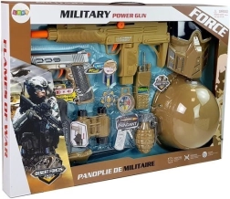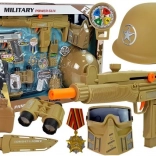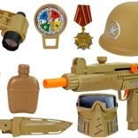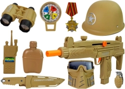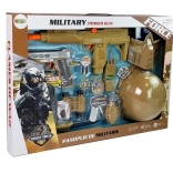 Velik vojaški komplet za male raziskovalce ponuja ure ustvarjalne zabave. Vsebuje čelado, masko, dve pištoli s svetlobnimi učinki in zvokom streljanja, granat, daljnogled, kompas, nož in druge dodatke. Vse je izdelano iz vzdržljive plastike in v enotni vojaški barvi. Odlično za preoblačenje, skupno igro in kot darilo – zapakirano v darilni škatli. Napajanje pištol: 3× AG13 (vključene). Primerno od 3 let, CE, EN 71.