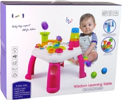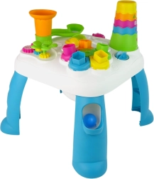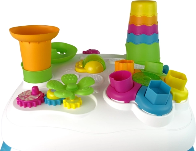 Barvita interaktivna mizica za najmlajše prinaša zabavo in učenje v enem. Ponuja svetlobne učinke, sortirnik oblik, spust za kroglice, vrtljiva zobniška kolesca in odstranljive nogice. Podpira fino motoriko, prepoznavanje oblik in barv ter razvoj čutov. Stabilna, varna konstrukcija iz netoksičnih materialov razveseli otroke od 18 mesecev naprej.