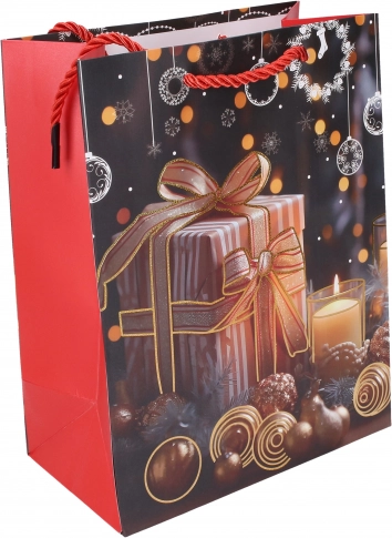 Stilska božična darilna vrečka velikosti M (26 × 32 × 10 cm) za preprosto in elegantno zavijanje daril. Ponuja čvrsto izvedbo, praktične mere in praznični dizajn.