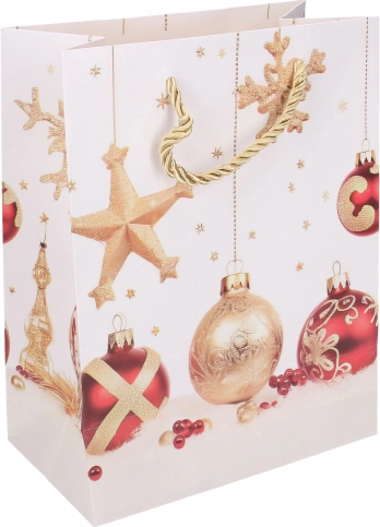 Stilska darilna vrečka velikosti S z merami 18 × 23 × 10 cm z motivom Božič. Idealna za majhna darila, z močnimi ročaji in kakovostnim papirjem za varno in elegantno zavijanje. Na voljo 4 različice dizajna.