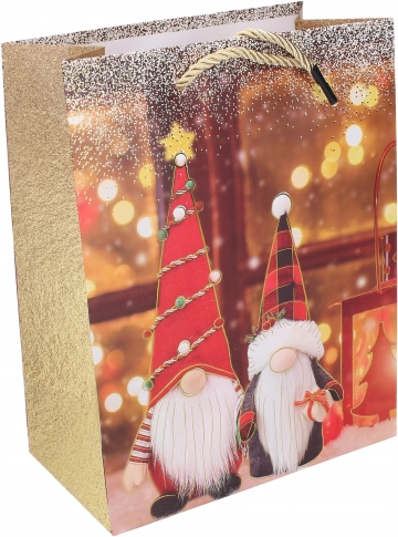 Stilska božična darilna vrečka velikosti S (23 × 18 × 10 cm) omogoča elegantno zavijanje daril brez rezanja papirja. Idealna za manjša presenečenja, na voljo v 4 različicah in s trdnimi ročaji za udobno nošenje.