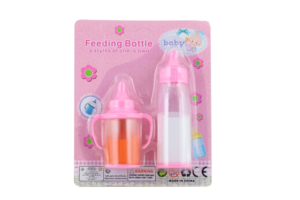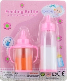Komplet stekleničk s hrano za punčko. Material plastika. Vsebuje tekočine. Pakirano na kartonu. Dimenzije 17 × 14 × 3,5 cm. Starost 3+