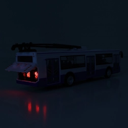 Upravljanje je preprosto in zabavno: vrata odprete ročno, zaprete jih s pritiskom na gumb na strehi in opazujte, kako ob zapiranju utripajo sprednje luči. Trolejbus vozi na povratni pogon, zato se zlahka požene po tleh. Baterije LR44/AG13 so že priložene, tako da se lahko igrate takoj po odprtju škatle.
