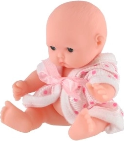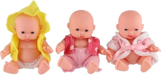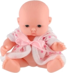 Prisrčen dojenček punčka višine 12 cm s trdnim plastičnim telescem in tekstilnimi oblačili razveseli vsakega malega skrbnika. Na voljo 3 različne vrste, spodbuja domišljijo in igro vlog ter je primerna od 3 let dalje. V praktičnem displej boksu po 12 kosov.