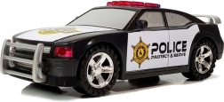 Črno-bel patruljni avto z modro lučjo, oznakami in odbijačem za akcijsko zasledovanje. Idealno za igro vlog in učenje varnostnih pravil na igriv način.