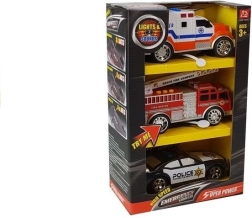 Ta komplet reševalnih vozil bo navdušil vse male ljubitelje akcije in napetosti. V pakiranju najdete policijski avto, gasilno vozilo in rešilni avtomobil – vsak model ima izrazite barve, značilne napise in elemente, ki otrokom približajo delo resničnih služb nujne pomoči. Po pritisku na gumbe se prižgejo rdeče luči in zaslišijo sirene ter hupa, zato je igra še bolj realistična.