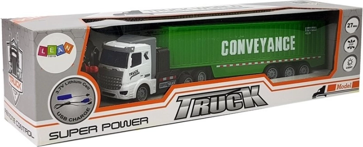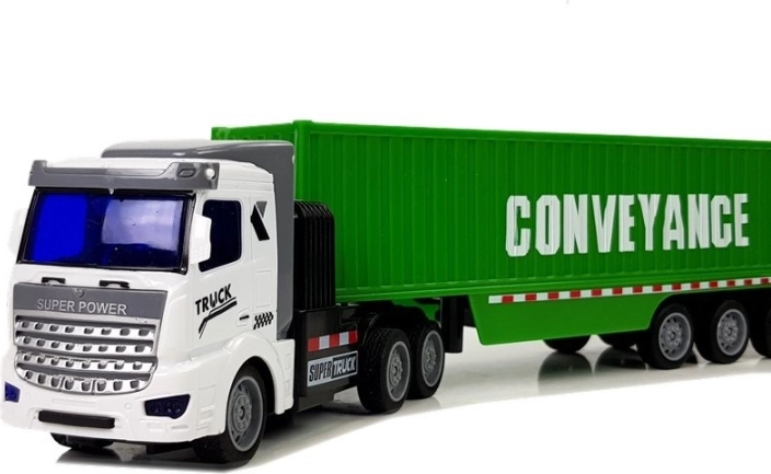 Ta daljinsko voden tovornjak zvesto posnema pravi cestni voz – bela kabina, zelena prikolica in značilni detajli navdušijo na prvi pogled. Enostavno upravljanje z dvema ročicama omogoča vožnjo naprej/nazaj in zavijanje desno/levo, pri čemer kabino pri vožnji naprej osvetlijo modre LED diode.