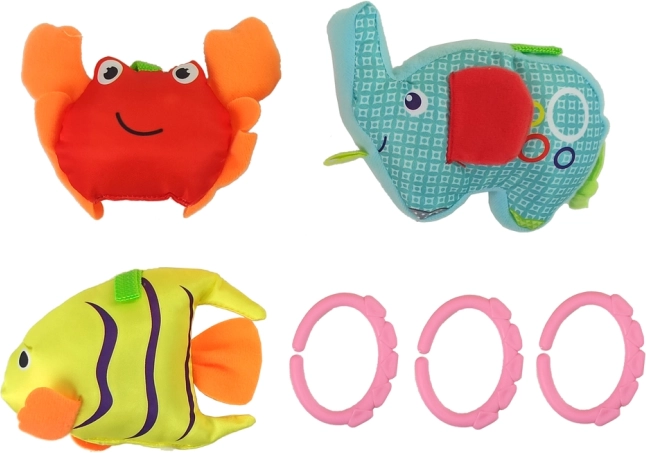 - 3 viseče plišaste igrače (ribica – ropotuljica, slonček – melodija, rak – piskalec)