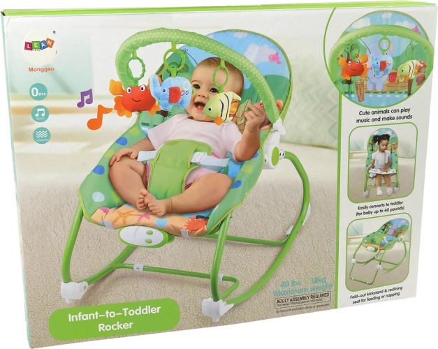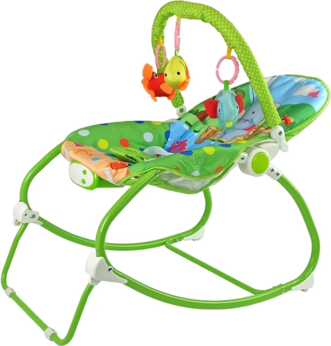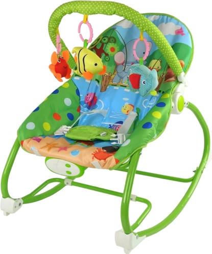 Večnamenski otroški ležalnik in gugalnik 2v1 v zeleni izvedbi ponuja pomirjujoče vibracije, nežno zibanje in viseči lok s plišastimi igračami za razvoj čutov. Zahvaljujoč nastavljivemu sedežu, pralnemu prevleku in 3-točkovnemu pasu je varen in udoben od prvih dni življenja do približno 3 let (do 18 kg).