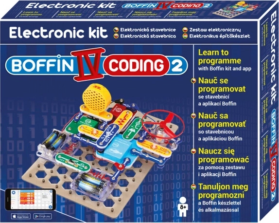 Elektronski komplet Boffin IV Coding je idealna izbira za otroke in odrasle, ki želijo osvojiti osnove elektronike in se hkrati naučiti programirati. Dele preprosto pripnete na ploščo in v nekaj trenutkih sestavite delujoče projekte – od svetlobnih efektov in zvočnih vezij do letečega propelerja in ventilatorja. S seznanitvijo prek modula U33 z brezplačno aplikacijo Boffin (Google Play / App Store) lahko projekte v slovenščini upravljate in programirate.