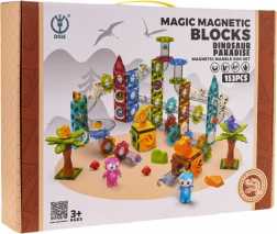 - strukturni elementi za kroglične steze, .- 42 magnetnih elementov: * 38 kvadratov, .* 2 trikotnika, * 2 elementa v obliki E, - 8 barvnih kroglic, .- figurica dečka in deklice s premičnimi deli, .- 9 figur dinozavrov, .- 2 figurici gob, .- 6 kosov dreves, - piščanec, .- 4 x živali, - 16 obročev v obliki sonca, .- okrasne nalepke, .- slikovni priročniki za sestavljanje različnih modelov. . |