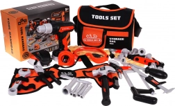 Ta bogato opremljen komplet orodja otrokom ponuja realistične delovne izkušnje. Plastični akumulatorski vrtalnik v črno-oranžni barvi ima zamenljive bite, dve smeri vrtenja za vijačenje in odvijanje ter odstranljiv »akumulator« za še bolj pristno igro. Napajanje: 2× AA 1,5 V (nista priloženi).