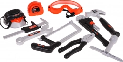 Kladivo, klešče, žagica, ključi, izvijač z nastavki, kotnik, meter, vijaki, matice, vložki, spojni deli in zaščitna očala – vse za ustvarjalno sestavljanje.