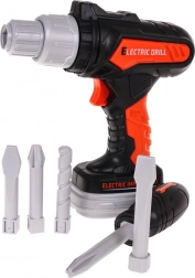 Plastični električni vrtalnik z zamenljivimi biti je videti kot pravi. Zna vijačiti in odvijati, ima ergonomsko obliko in odstranljiv »akumulator«. Napajanje 2× AA (nista priloženi).