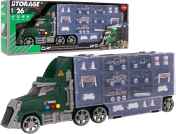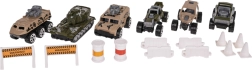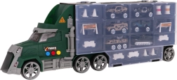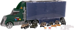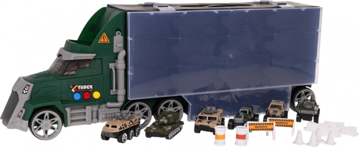 Set vključuje 6 kovinskih/odprtih avtomobilčkov tipa “resorak” in bogate dodatke (stožci, ograjice, pregrade, sodi) za gradnjo lastnih ovir in vojaških scenarijev. Priročen ročaj za prenašanje otroku olajša, da tovornjak vzame kamor koli s seboj.