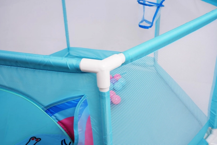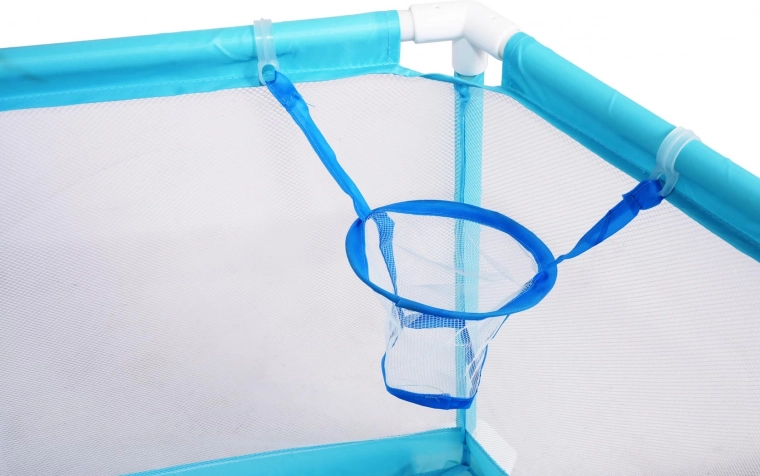 Vgrajen koš v notranjosti ograje spodbuja aktivno igro in razvoj koordinacije. Priloženih je 50 barvnih žogic.