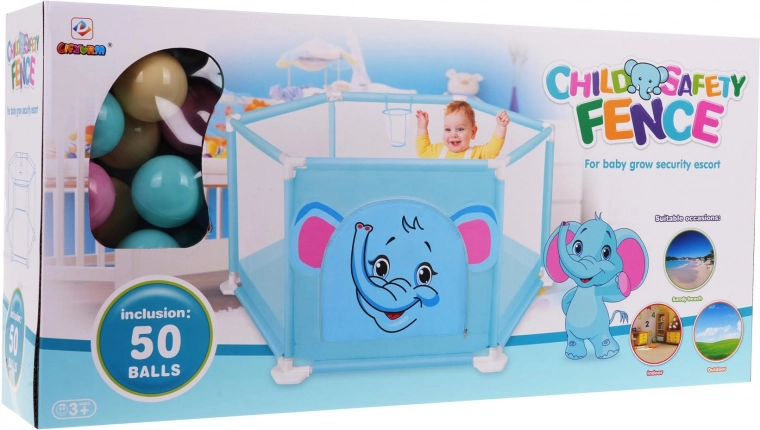 Del paketa je 50 barvnih žogic, znotraj pa je tudi koš za metanje, ki podpira motoriko in zabavno aktivnost. Ograja je lahko prenosna, primerna za notranjo in zunanjo uporabo, njene površine pa se enostavno vzdržujejo.