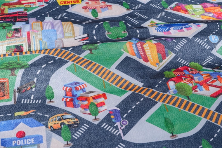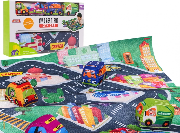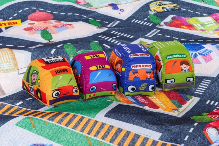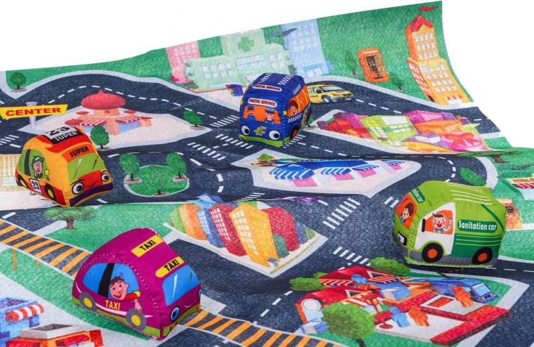 Odkrijte igrivo filc podlogo z motivom mesta in 4 mehkimi avtomobilčki za najmlajše od 6 mesecev. Podloga ponuja pisan tisk ulic in stavb, spodbuja domišljijo in varno igro. Enostavna je za vzdrževanje, ima žive barve in je idealna za prve motorične spretnosti.