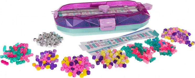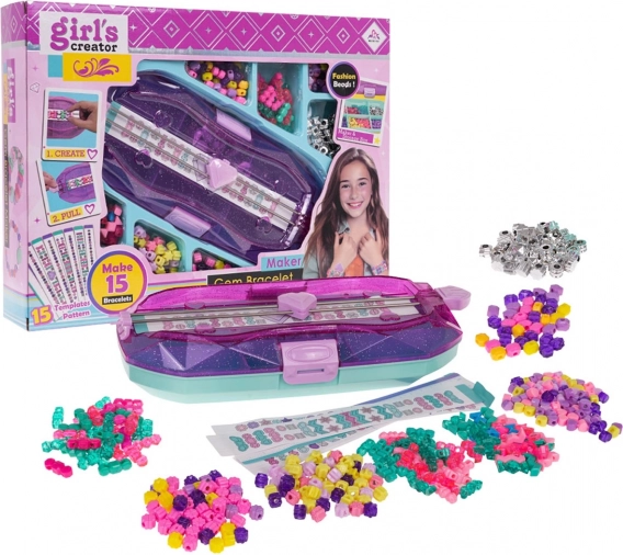 Kreativni komplet za izdelavo zapestnic za otroke 5+. 400+ perlic, 15 vzorcev, strojček s predalčkom, 2 vrečki vrvice in slikovna navodila. Spodbuja ustvarjalnost in motoriko.