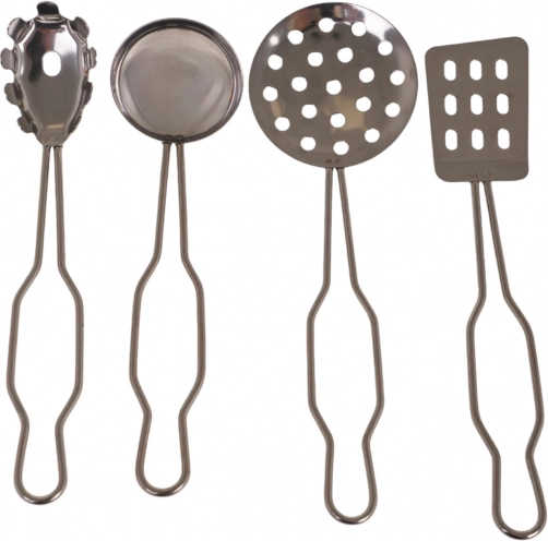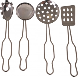 Vključene so tudi klešče, zajemalka, lopatica in luknjičasta žlica – vse, kar otroci potrebujejo za kuhanje in serviranje.