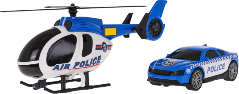 Zabaven policijski set za male varuhe reda vsebuje podroben helikopter in športni avto. Helikopter ponuja svetlobne in zvočne učinke, ročno vrtljive rotorje in je napajan z baterijami AG13 (v paketu). Policijski avto ima gumijaste pnevmatike in prosti tek za gladko vožnjo. Idealno za otroke od 3 let.