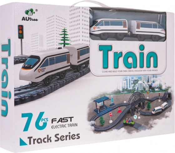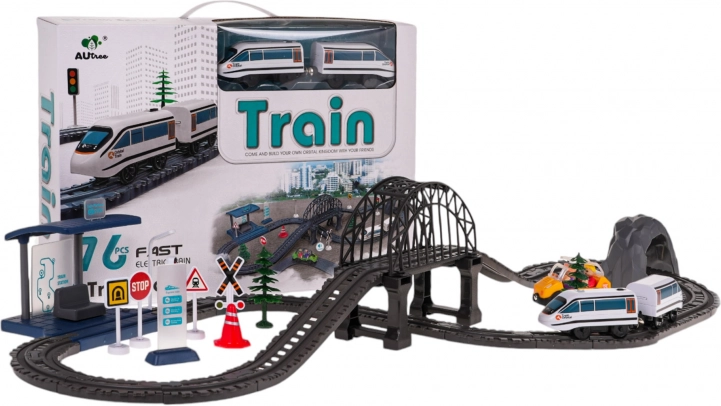 - Celovit set 76 delov – tirnice, vlak, postaja, most, tunel, TAKSI, znaki, drevesa in drugi dodatki.