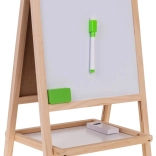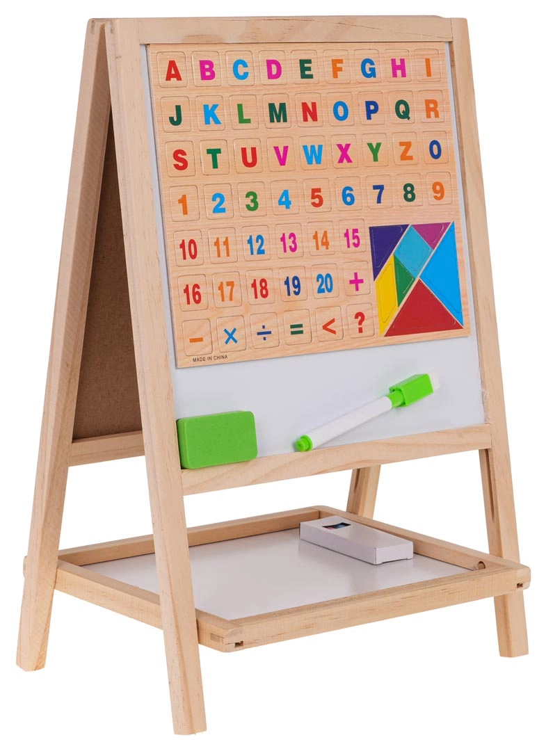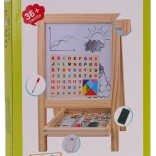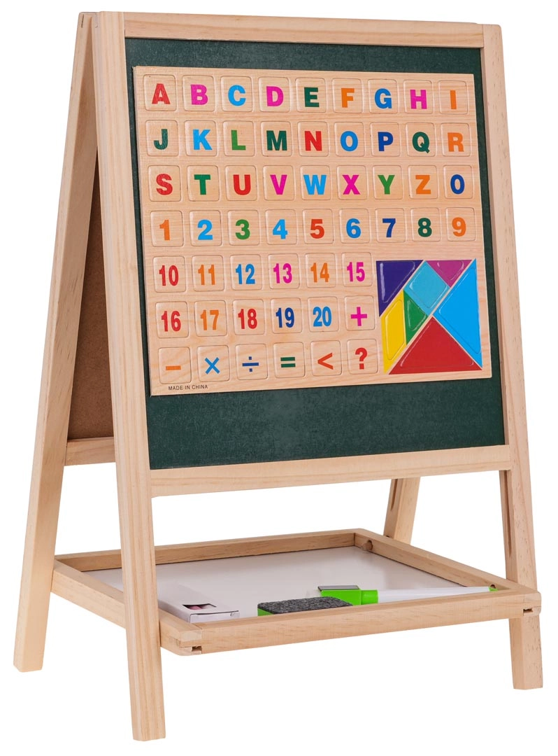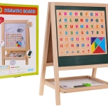 Lesena dvostranska tabla za otroke od 3 let. Ena stran je bela za risanje s flomastrom, druga črna za risanje s kredo. Tabla je na obeh straneh magnetna in vključuje črke, številke ter geometrijske like na magnetih.