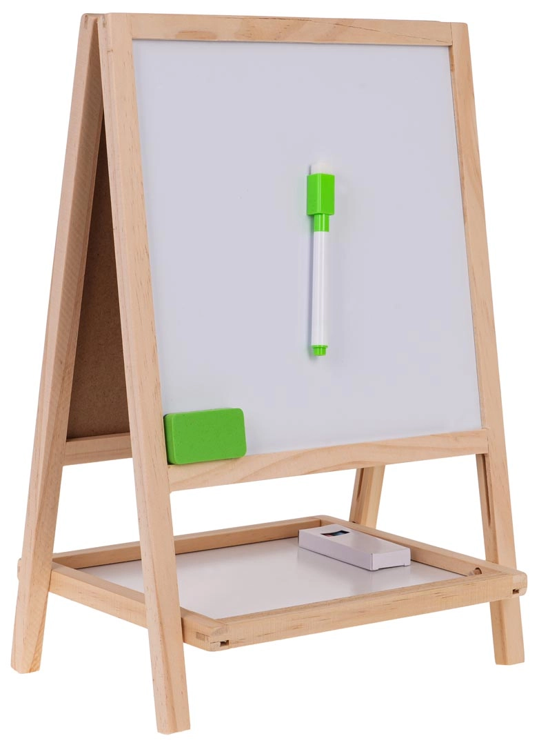 Dvostranska lesena tabla je idealna za ustvarjalno igro in učenje otrok, starejših od 3 let. Na eni strani jo lahko otroci uporabljajo s flomastrom, druga stran pa je namenjena risanju s kredo. Tabla je na obeh straneh magnetna, kar omogoča pritrjevanje magnetnih črk, številk, matematičnih znakov in prostorskih oblik. Praktična polička na spodnji strani table olajša shranjevanje vseh priloženih pripomočkov.
