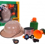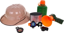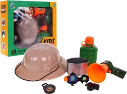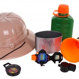 Komplet Malega Odkritelja je idealen za otroke od 3 let. Vsebuje klobuk, plastenko za vodo, megafon, uro, kompas in piščalko, ki spodbujajo otroško domišljijo.