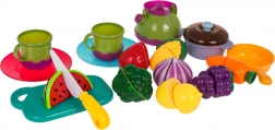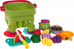 Vključuje košaro s pokrovom, desko za rezanje, nože, lonce, ponve, kozarce in druge kuhinjske pripomočke za realistično igro.