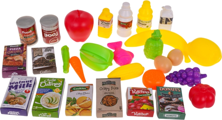 Sadje, zelenjava, pijače, konzerve in škatlice z živili – vse za realistično igro nakupovanja in kuhanja.