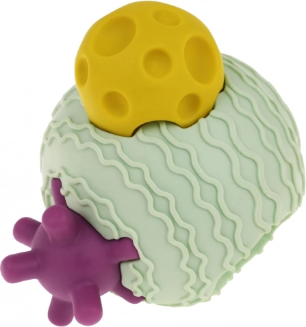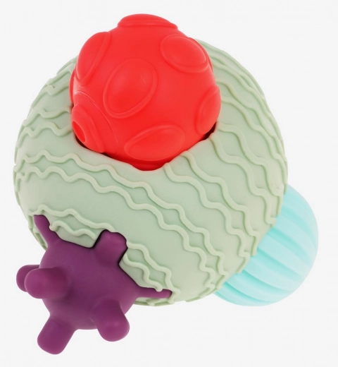 Ta senzorična žoga je idealen spremljevalec za kopanje malčkov. Set vključuje veliko žogo in štiri manjše žoge z različnimi teksturami in oblikami. Glavna žoga ima vdolbine, kamor se vstavijo manjše žoge, kar pomaga otroku pri učenju prepoznavanja različnih barv in oblik.