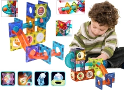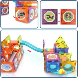 Magnetna sestavljanka z 49 kosi združuje ustvarjanje, svetlobne učinke in dinamiko kroglične steze. Prosojni modri, oranžni in rumeni elementi se preprosto povezujejo in ustvarjajo 3D konstrukcije s tuneli, mostovi in zavoji. Svetleče kroglice in osvetljeni moduli dajejo igri atraktiven videz ter spodbujajo radovednost otrok.