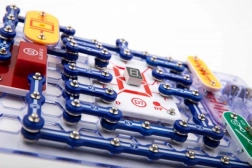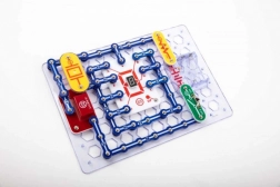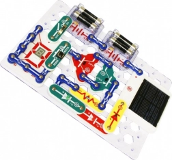 Deli se pritrdijo na osnovno ploščo s snap kontakti. Barvno razlikovanje in opisi komponent olajšajo orientacijo tudi otrokom od 8 let.