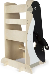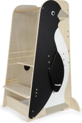 Stolp ima višinsko nastavljivo platformo in stopnico, zato se zlahka prilagodi otrokovi rasti. Pametna zložljiva »krila« pingvina ponujajo praktičen prostor za shranjevanje krp in drobnarij, da imate vse pri roki. Priporočeno za otroke od 2 let; otrok mora biti vedno pod nadzorom odrasle osebe.