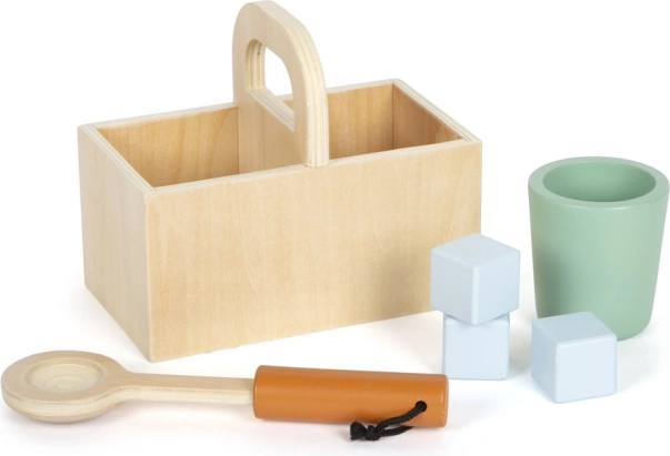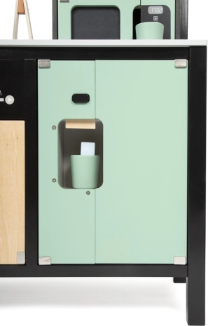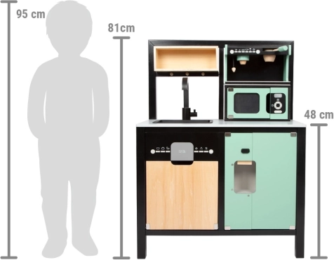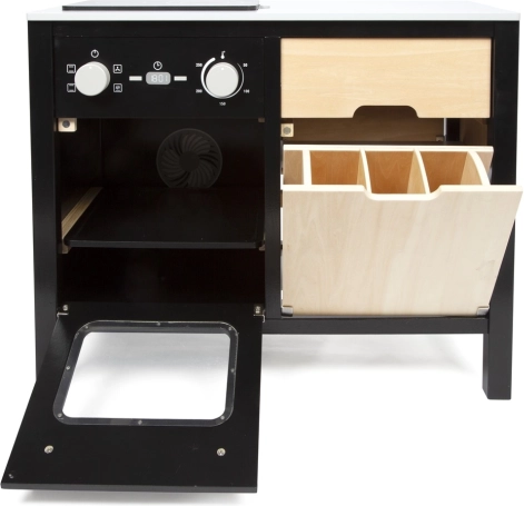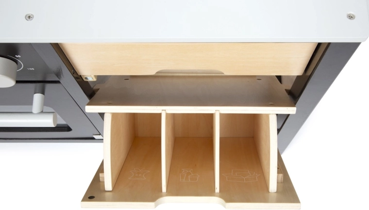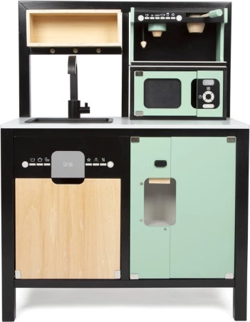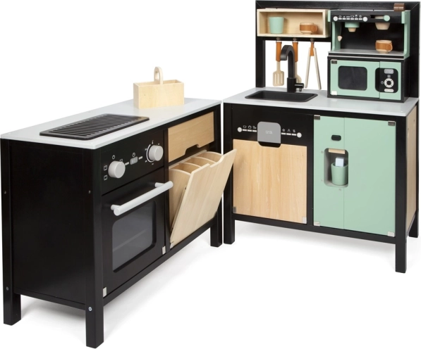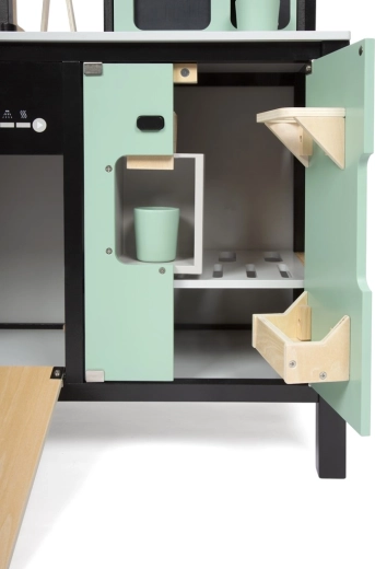 Kakovostna lesena izdelava, odpirajoča se vratca ter številne police in predelki poskrbijo za red v vsaki kuhinji. Otroci vadijo organizacijo, fino motoriko in socialne veščine.